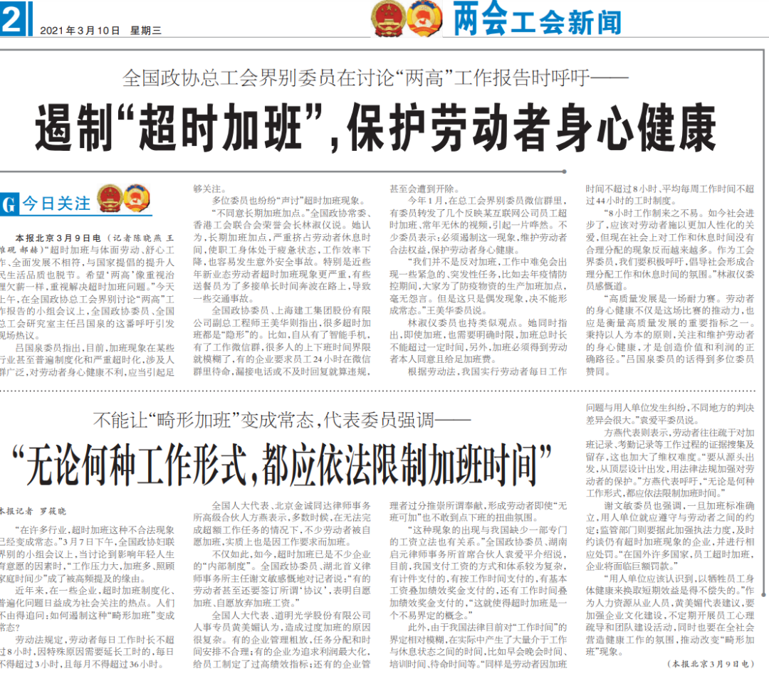 2021年的全国两会期间,工人日报就关注劳动者的休息权利保障问题,撰写报道《遏制“超时加班”,保护劳动者身心健康》直击“996”等超时加班现象,记录了全国政协总工会界别委员对超时加班现象的讨论,呼吁“遏制超时加班,保护劳动者身心健康”。该报道既有事实依据,又有理性分析,切实维护了劳动者的合法权益,也引发了社会对这一问题的广泛关注和深入讨论。最终荣获第32届中国新闻奖二等奖。