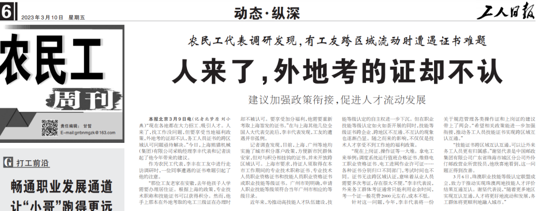 比如,2023年全国两会期间,工人日报记者聚焦农民工人大代表提到的“人才评价结果跨区域认定难”情况,刊发《人来了,外地考的证却不认》报道,并获第34届中国新闻奖二等奖。